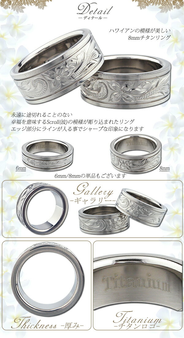 商品説明 商品番号 HR2M-016-TI-S8S8 商品名 ハワイアンジュエリー ハワイアン ペアリング 刻印無料 指輪 リング チタン ストレートエッジ スクロール プルメリア サイズ 幅約8mm 厚み約2mm 素材 チタン 色 黒灰色 形/縁 フラット/ストレートエッジ コメント チタンでできた新感覚のハワイアンジュエリー。