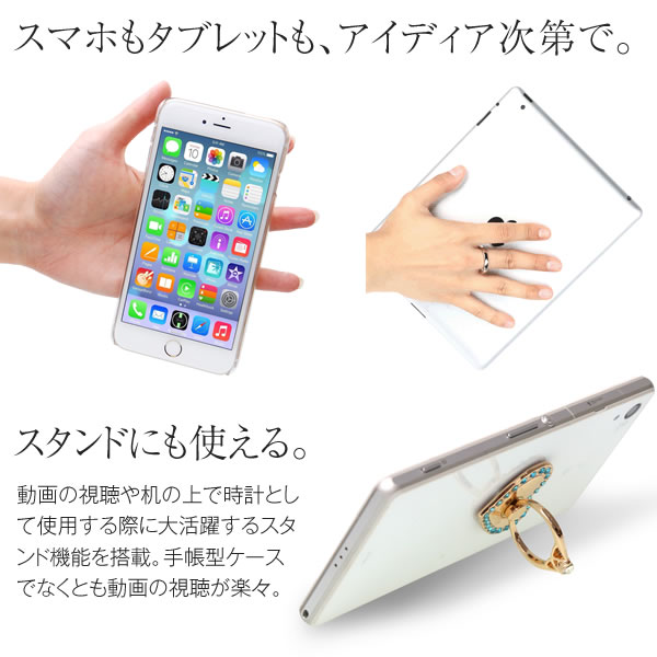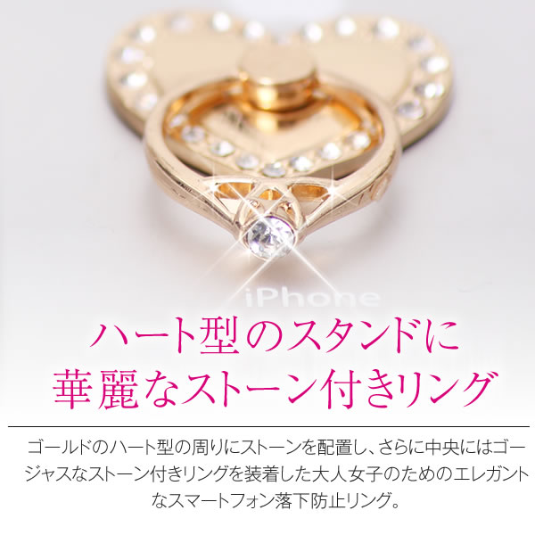 カラーホワイトレッドブルーブラック素材スチール商品説明ハート型のスタンドに華麗なストーン付きリングゴールドのハート型の周りにストーンを配置し、さらに中央にはゴージャスなストーン付きリングを装着した大人女子のためのエレガントなスマートフォン落下防止リング。